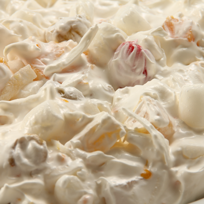 We keep this 1950s-style dessert traditional, yet fun with peaches, pineapple, pears, Mandarin oranges, marshmallows and a light & fluffy sour and whipped cream dressing.