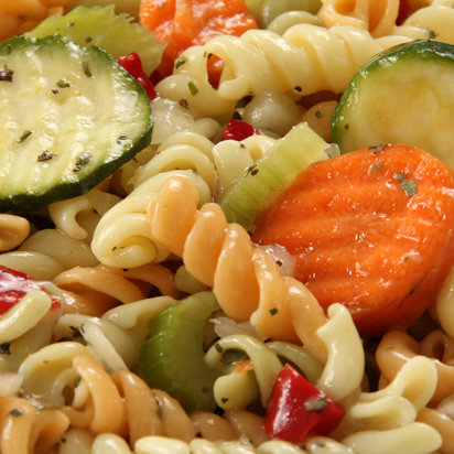 Rotelli pasta with zucchini, carrots, celery, bell peppers splashed with a zesty Italian vinaigrette dressing.