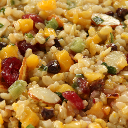 Al dente brown rice infused with a honey dressing with mangoes, green onions, cranberries, currants, and sliced almond round up this wonderful salad.