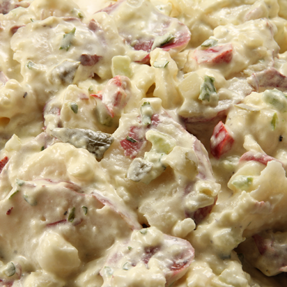 Select red-skin potatoes sliced and tossed with egg slices and spices in a creamy mayonnaise dressing.